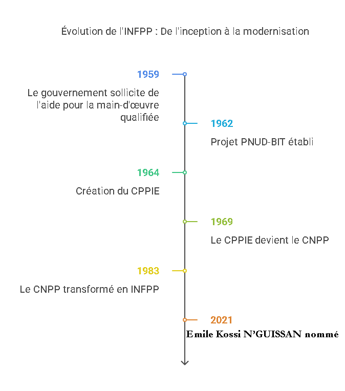 Le 20 juin 1983 l’Institut National de Formation et de Perfectionnement Professionnels (INFPP) est créé par la loi n° 83-19 en remplacement du Centre National de Perfectionnement Professionnel (CNPP) pour répondre aux besoins de formation et de perfectionnement professionnels tant pour les formateurs que pour le personnel du monde de travail et les artisans.